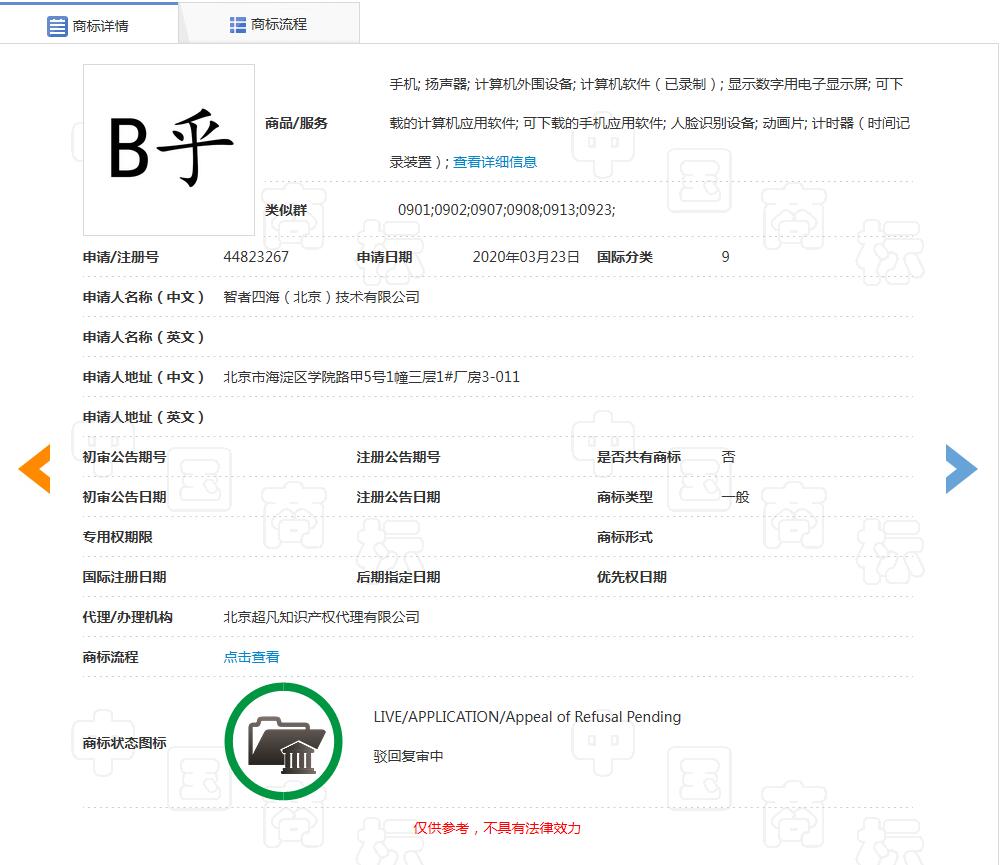 近期,知乎关联公司智者四海(北京)技术有限公司申请的B乎商标被予以驳回,商标国际分类涉9类科学仪器。