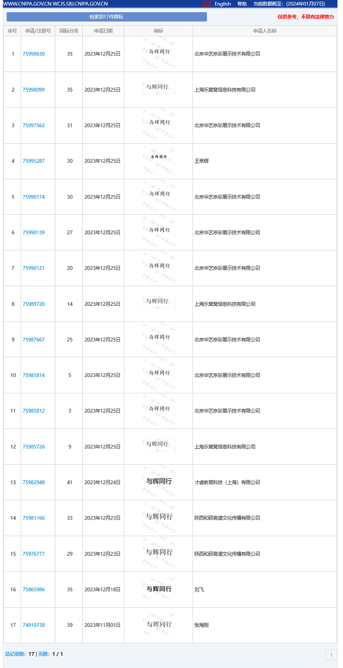中国商标网查询显示,“与辉同行”已被多方申请注册为商标,申请人包括北京华艺京彩展示技术有限公司、陕西和硕斋道文化传播有限公司、上海乐窝窝信息科技有限公司、才睿教育科技(上海)有限公司 及多位自然人,国家分类涉及旅游、广告销售、教育娱乐、日化用品等,当前商标状态均为等待实质审查。